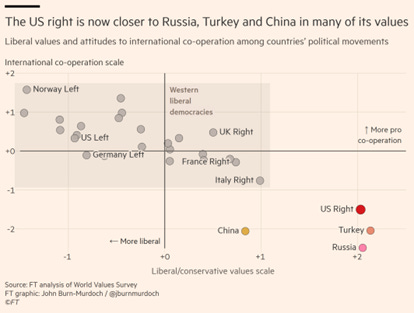 Rufo believes he is leading a revolution for classical liberalism. Meanwhile, his conservative allies dream of turning America into a Christian version of Turkey. The latest analysis of the World Values Survey shows that, when it comes to supporting self-expression over security, favoring international cooperation, or desiring “a strong leader who doesn’t need to bother with elections,” the American right now aligns with backwards autocracies led by Erdogan and Putin.