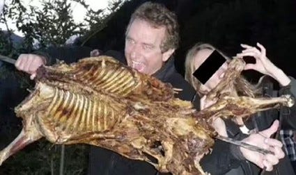 Secretary of Health and Human Services Robert F. Kennedy, Jr. eating what may be a dog. Since the animal (whatever it is) has been cooked, it is probably not the source of Kennedy’s brain parasite.