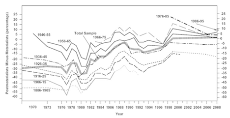 “Cohort analysis: Percentage of Postmaterialists minus percentage of Materialists in six West European countries (Britain, France, West Germany, Italy, Belgium and The Netherlands), 1971–2009,” from Ronald Inglehart’s Cultural Evolution, Figure 2.2.